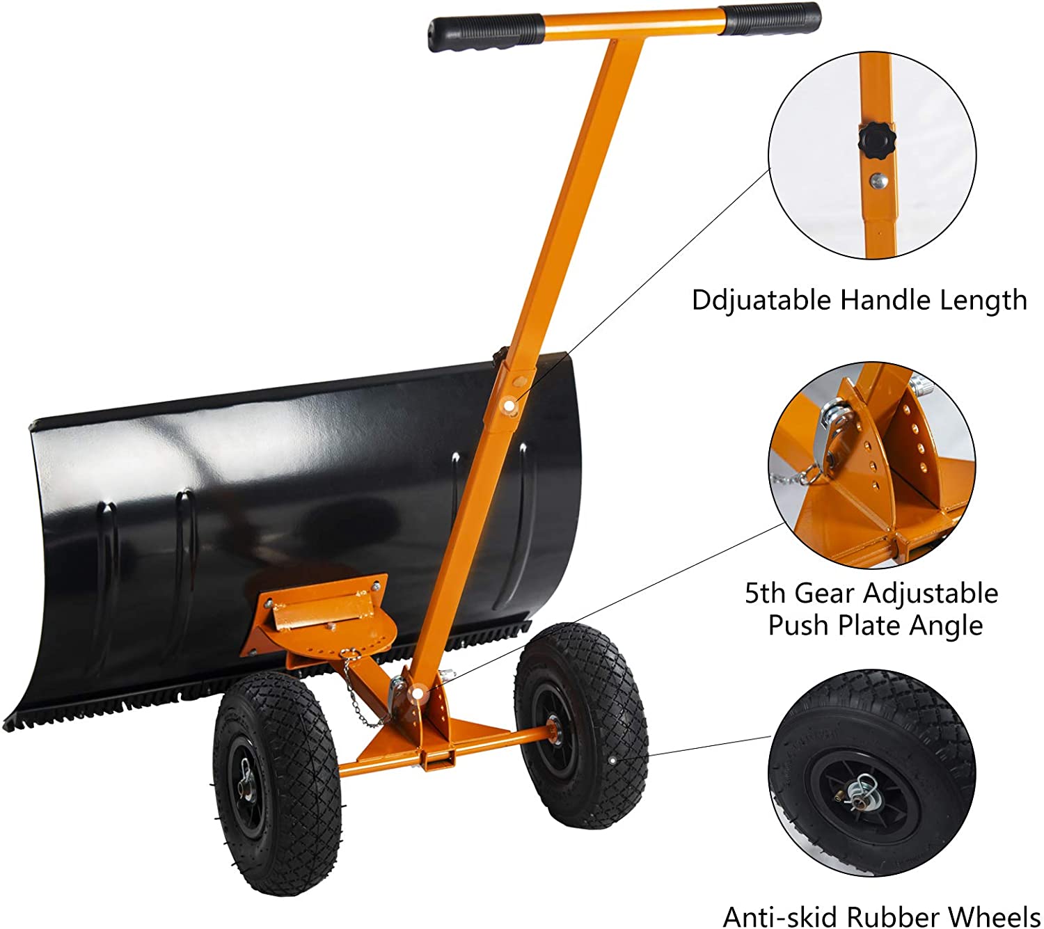 - Anti-skid Wheels:10in rolling snow pusher wheel wear resistant rubber material and snow anti-skid texture. With wheels rolling, easily push snow shovel for snow removal more smoothly and easily.